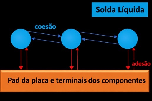 As forças de adesão são as forças de atração que as partículas de um material exercem sobre as partículas de outros materiais diferentes. Ela é crucial para a formação da ligação metalúrgica, pois representa a atração entre a solda líquida e as superfícies dos pads e componentes a serem unidos. Para uma soldagem eficaz, as forças de adesão devem ser fortes o suficiente para "molhar" (espalhar uniformemente) a superfície da placa a ser soldada e superarem a tensão superficial, promovida pelas forças de coesão.