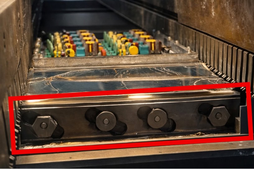 Distância dos bocais em relação ao conveyor: Mecanicamente também existe a possibilidade de aumentar o tempo de contato entre a placa e a solda no tanque, similar ao que foi comentado no tópico sobre a "Rotação das bombas do tanque", porém no caso da distância entre bocais e conveyor, o aumento do tempo de contato se dá pela pequena distância entre a onda e a placa devido ao posicionamento dos bocais. Esta posição pode ser ajustada através de parafusos que existem nas extremidades de cada bocal. Estes parafusos não servem apenas para fixar o tanque, mas também para nivelar os bocais e ajustar sua altura em relação ao conveyor. Mas qual a altura ideal? Esta altura deve ser inicialmente checada no manual de cada máquina e medido com um paquímetro ou gabarito adequado. Além disso, deve-se considerar também as características do produto a ser soldado (componentes do lado bottom da placa) e condições de desenho do palete de solda (caso utilizado no processo), pois em muitos casos, algumas partes do palete ou componentes do lado bottom, acabam tocando os bocais e segurando a placa ou palete ao passar pelo tanque, e isso não é a condição ideal. A correlação entre esta variável e os curtos, é que quando mais próximo dos conveyor, maior será o tempo de contato entre a placa e a solda, o que irá resultar em curtos de solda.