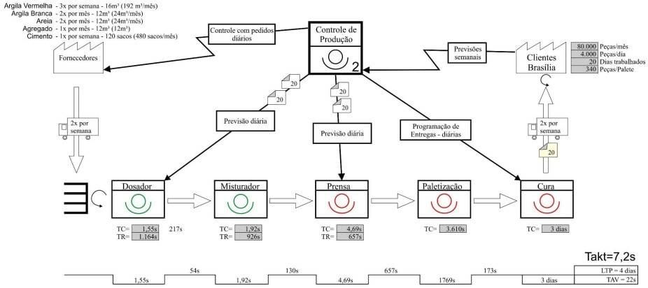 - Mapeamento do Estado Atual: Com base nas informações coletadas, elabore o fluxo do estado atual, calcule o takt time e o valor agregado(%).